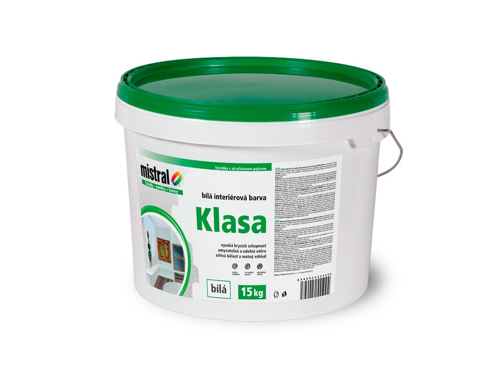 Interiérová akrylátová barva Klasa je vysoce bílá, částečně omyvatelná barva s výbornou kryvostí v jedné vrstvě, vhodná na sádrokarton, omítky, betonové panely, strukturované a sklovláknité tapety.