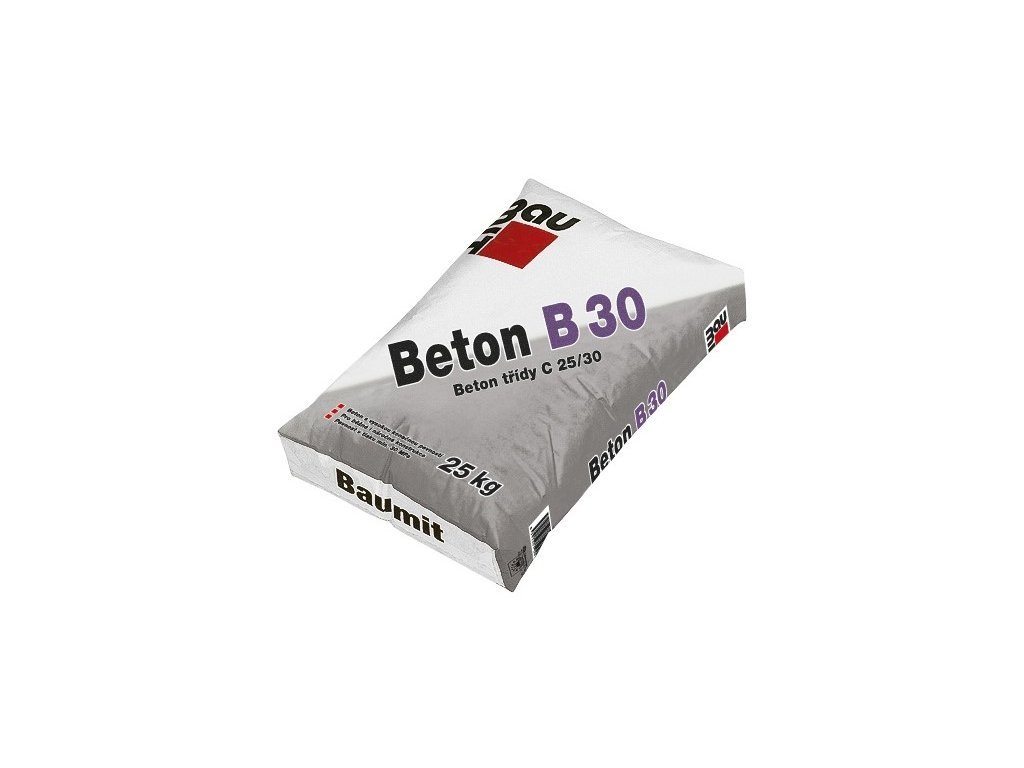 Baumit B 30 beton třídy C 25/30 30MPa beton o zrnitosti 4 mm. Beton je vhodný pro betonářské práce v domě i na zahradě, jako např. podklad pod dlažbu, základy, schody, překlady, stropy a opěrné zdi.