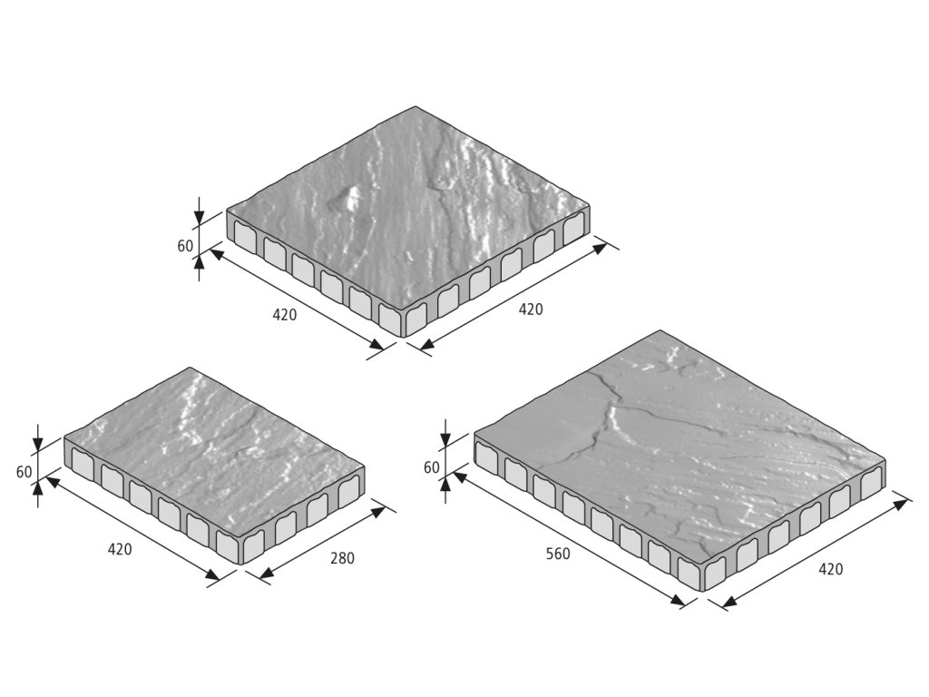 VLASTNOSTI: • dodává se v sestavě 3 kamenů • je možnost zvolit ze 2 povrchových úprav: standard, sametový UV • pro pochozí plochy jsou určené dlaždice s výškou 60 mm