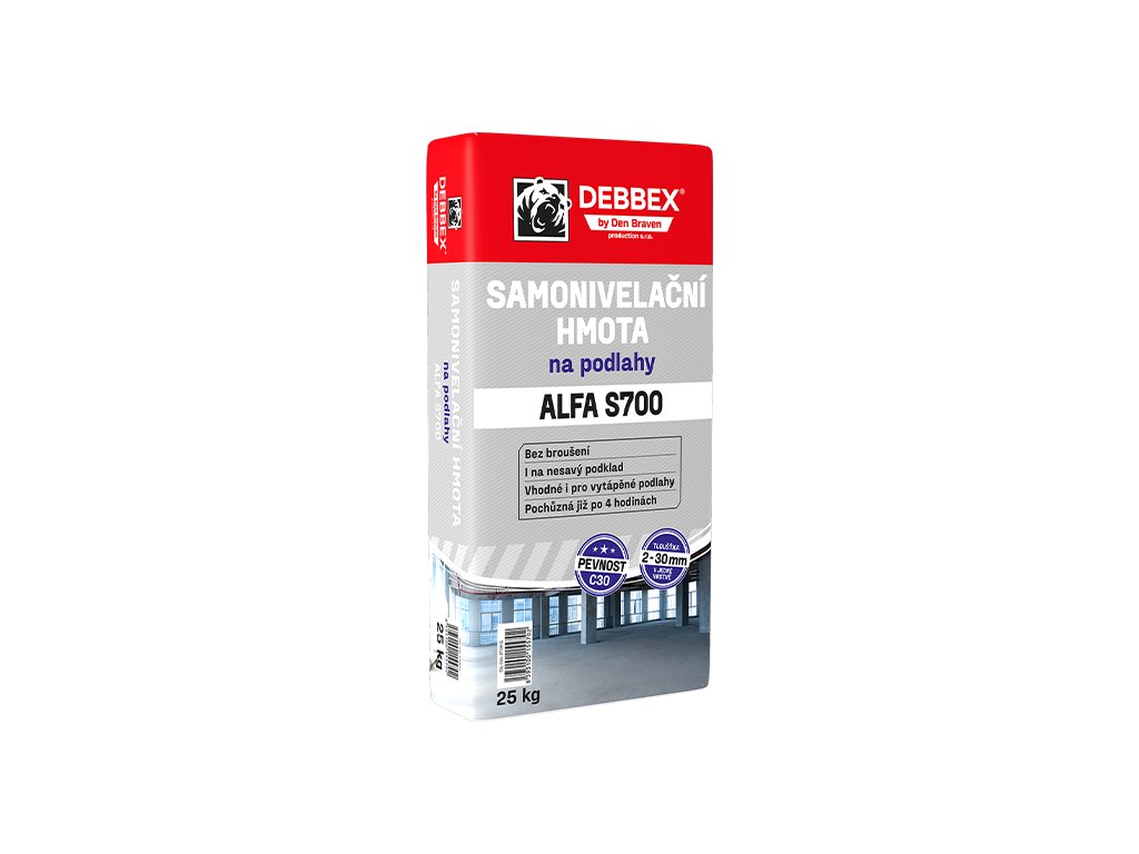 Samonivelační potěrová směs ALFA S700 Den Braven na bázi ALFA sádry, plniv a speciálních zušlechťujících přísad, vytvrzující odpařením vody, vytváří trvale pevný s betonem srovnatelný povrch. Pro tloušťky 2 - 30 mm.POUŽITÍ: • Vyrovnávací hmota pro zhotovení vnitřních pochůzných potěrů na pevné podklady jako např. Anhydrit, beton nebo mazanina, stará dlažba • Vyrovnání výškových rozdílů v jedné vrstvě 2- 30 mm; • Následně se kladou finální vrstvy podlahových krytin např.: plovoucí podlahy, dlažba, parkety, koberce nebo linoleum. • Zpracovatelnost směsi lze provádět ručně i strojně
