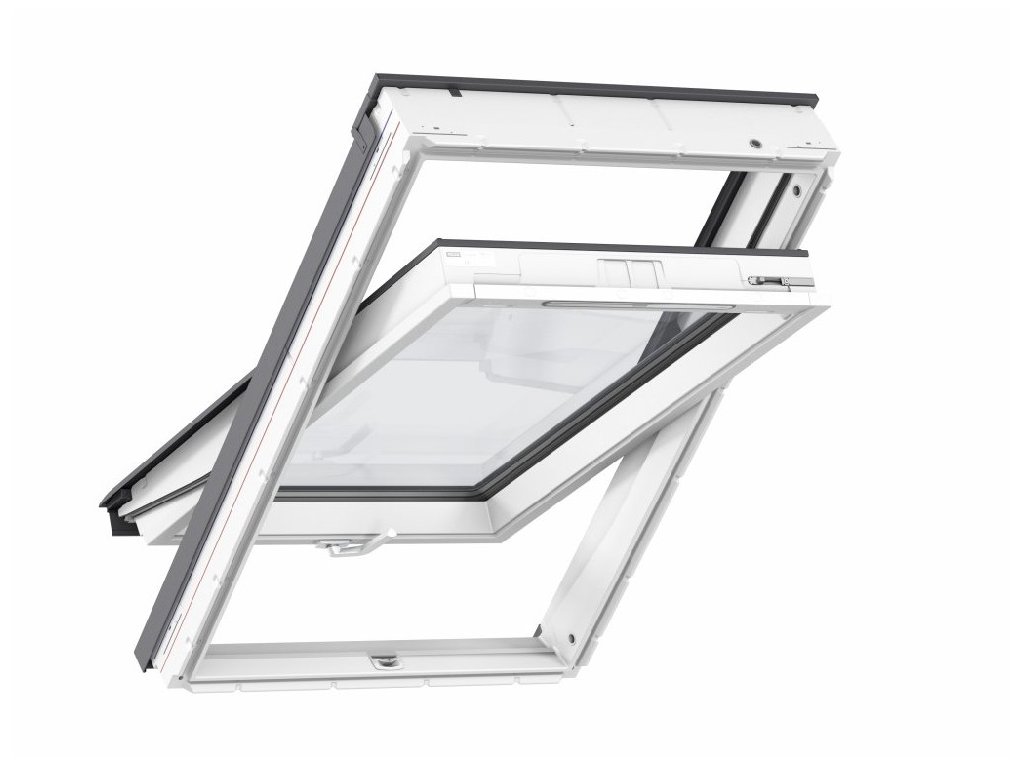 Střešní kyvná okna VELUX kategorie Standard je s dřevěným jádrem a lakem bílé barvy v řadě GLU unikátním spodním ovládáním.