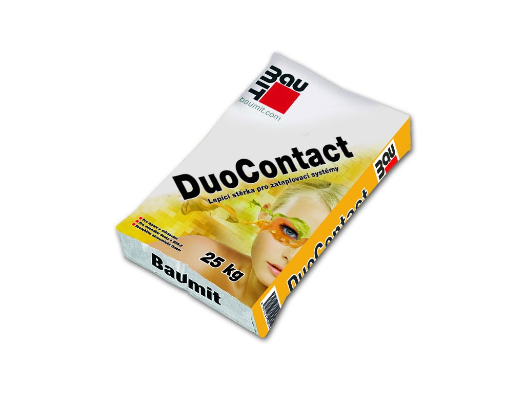Tmel lepící a stěrkový Baumit Duocontakt je lepení a stěrkování tepelně izolačních fasádních desek.POUŽITÍ: • lepicí a stěrková malta pro použití v interiéru i exteriéru, zejména pro lepení tepelně izolačních fasádních desek na podklad, pro provádění armovací a vyrovnávací stěrky s vložením sklotextilní výztužné síťoviny v tepelně izolačním systému Baumit Duo.